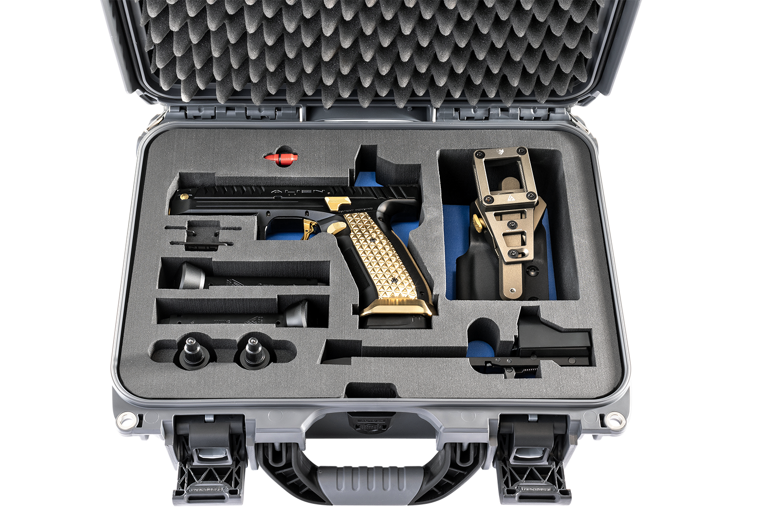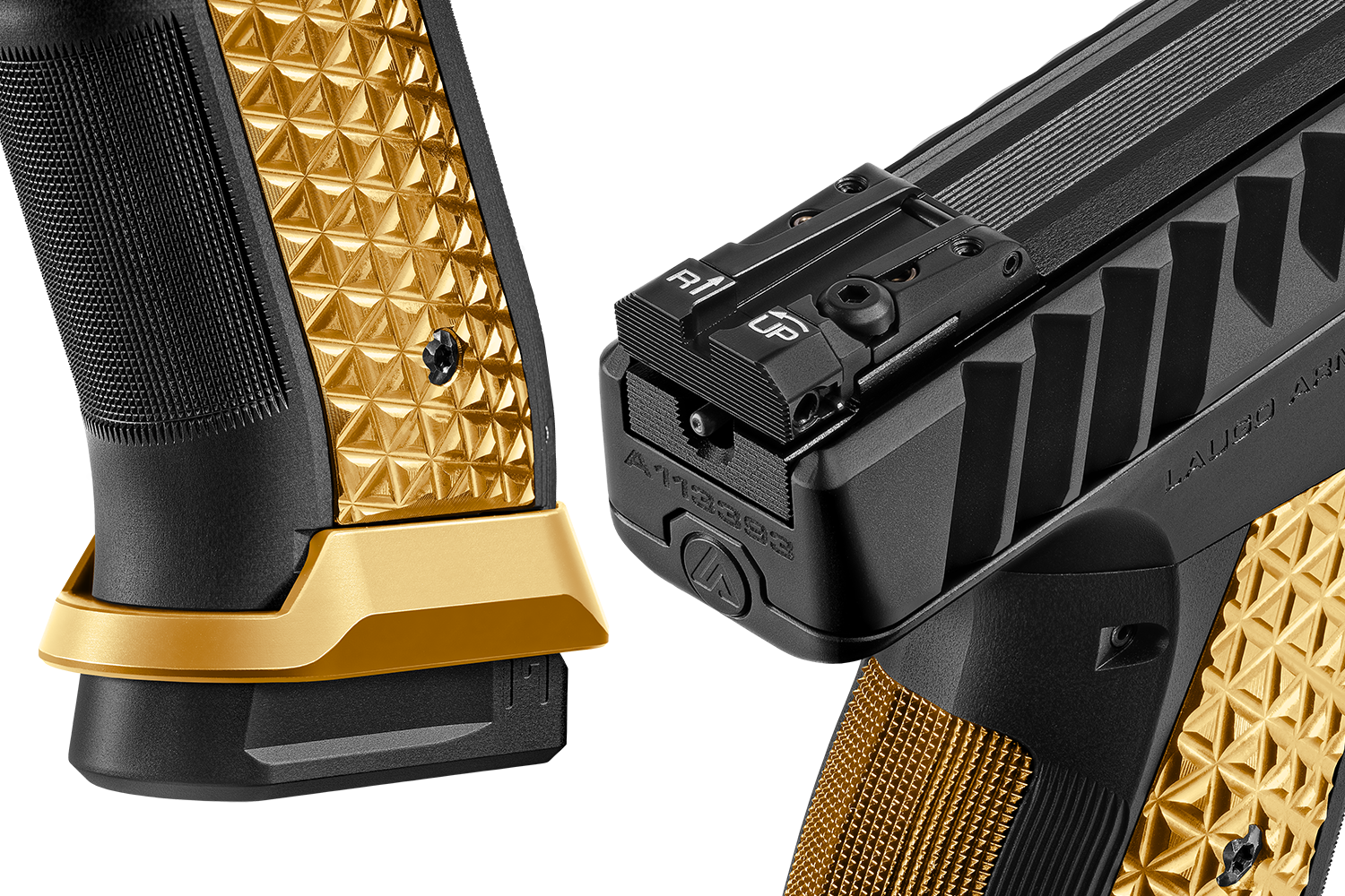Available in limited quantities, the Black and Gold Edition Laugo Arms Alien Full Kit is the ultimate package for enthusiasts and competitive shooters. An Iron Sight Top Rail and Optic Top Rail equipped with a Laugo Arms red dot sight are both included for maximum versatility. A magwell and Elornis Industries holster system complete the setup for optimal performance at the range. Gold-anodized brass grips and magwell add additional weight to help absorb recoil.