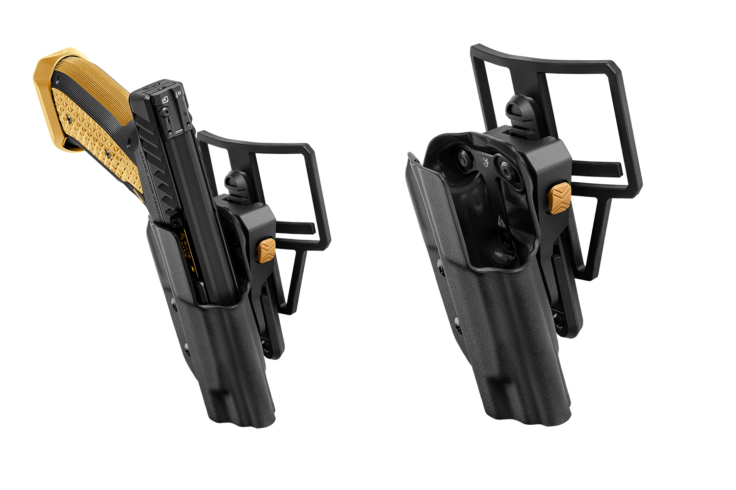 Available in limited quantities, the Black and Gold Edition Laugo Arms Alien Full Kit offers a standout appearance with its gold accents and black finish – a first for the Alien! Recoil absorption is enhanced through the gold-anodized brass grips and magwell, which add roughly 6 ounces of weight. An Iron Sight Top Rail and Optic Top Rail equipped with a Laugo Arms red dot sight are both included for maximum versatility. The Elornis Industries holster system completes the setup for optimal performance at the range.