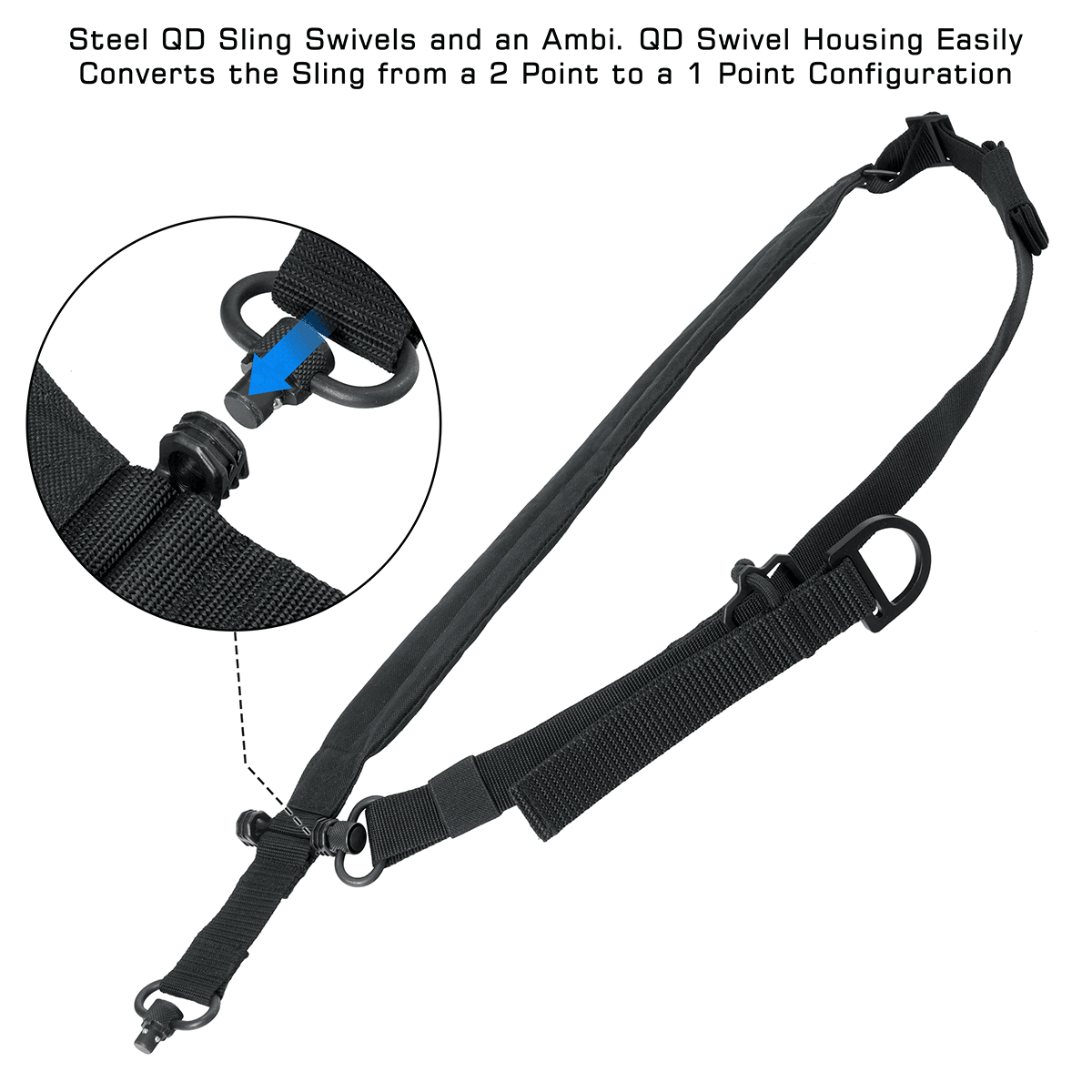 - Steel QD Sling Swivels and an Ambi. QD Swivel Housing Easily Converts the Sling from a 2 Point to a 1 Point Configuration