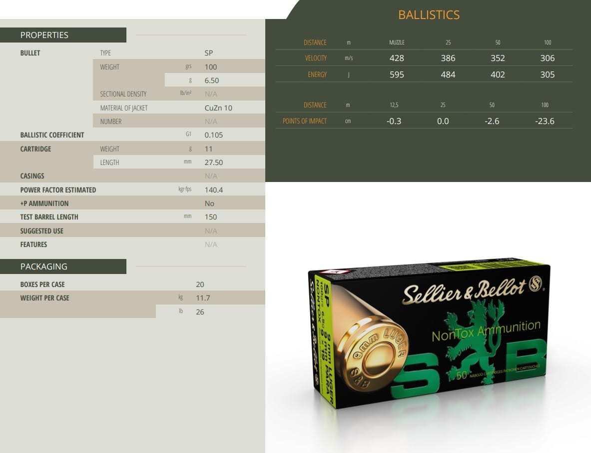 Naboj SB 9mm Luger (9×19) SP NONTOX 100gn / 6,5g (50)