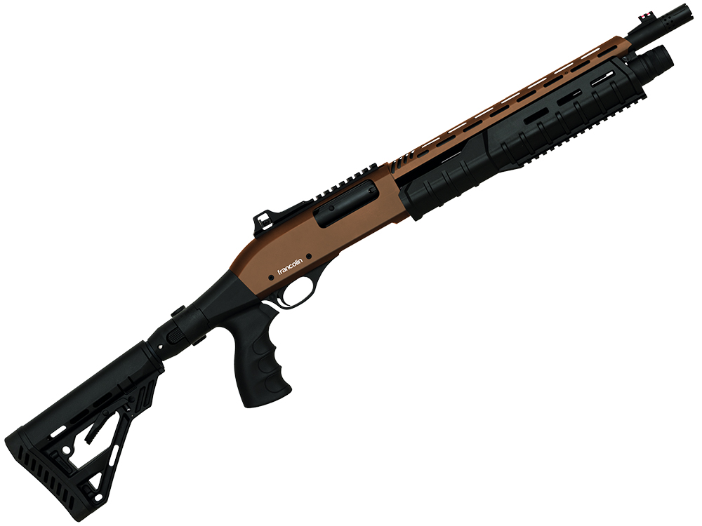 Potezna šibrenica Francolin Guardian Tax Bronze v kalibru 12/76 in cevjo 14″.Potezna šibrenica s teleskopskim kopitom z gumijasto ramensko kapo ter s pištolskim ročajem. Kapaciteta nabojnika / tube je 4 nabojev (4+1). Dolžina kromirane cevi z izmenljivimi čoki je 14″ . Sprednji merek je rdeče optično vlakno, zadnji merek na picatinny šini je nastavljiv v vse smeri.