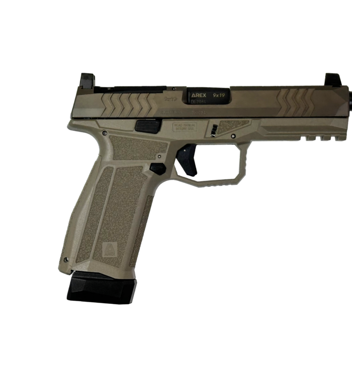 The platform is built on the AREX Delta architecture, utilizing a polymer frame with interchangeable backstraps, allowing ergonomic adaptation across different hand sizes. A low bore axis design and optimized slide mass distribution reduce muzzle rise and support faster follow-up shots under rapid fire conditions. The slide is machined from high-strength steel with a corrosion-resistant surface treatment for durability and service life.