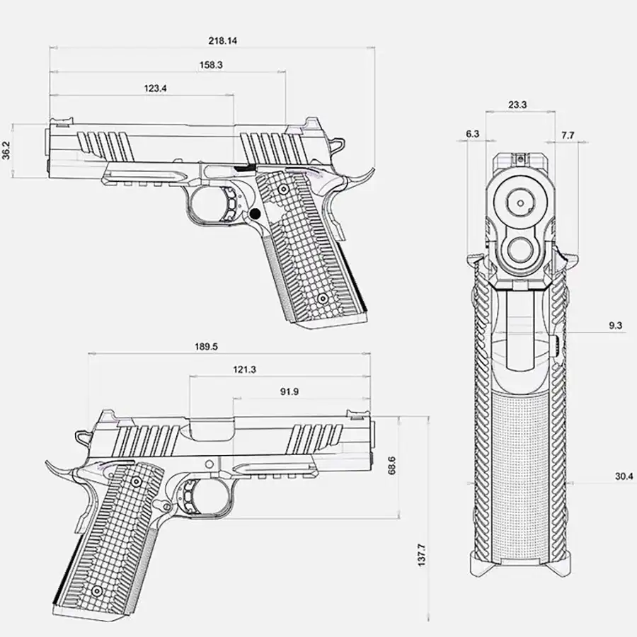 - Ogrodje: nerjaveče jeklo 1911 s pokrovom proti prahu s picatinny tirnico.