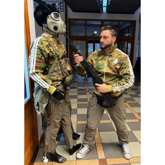 The jacket features three distinctive white stripes on the sleeves, paying homage to the Slavic heritage in a subtle yet stylish manner.
