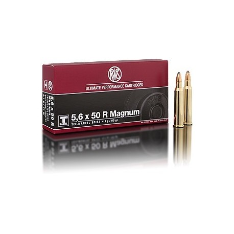 The RWS 5,6×50R Magnum TMS 4.1 g is a high-quality centerfire rifle cartridge built for light to medium game hunting and precision shooting. Featuring a soft point (SP) bullet with a 4.1 g (63 gr) projectile, this load delivers excellent energy transfer and consistent terminal performance within typical hunting ranges.