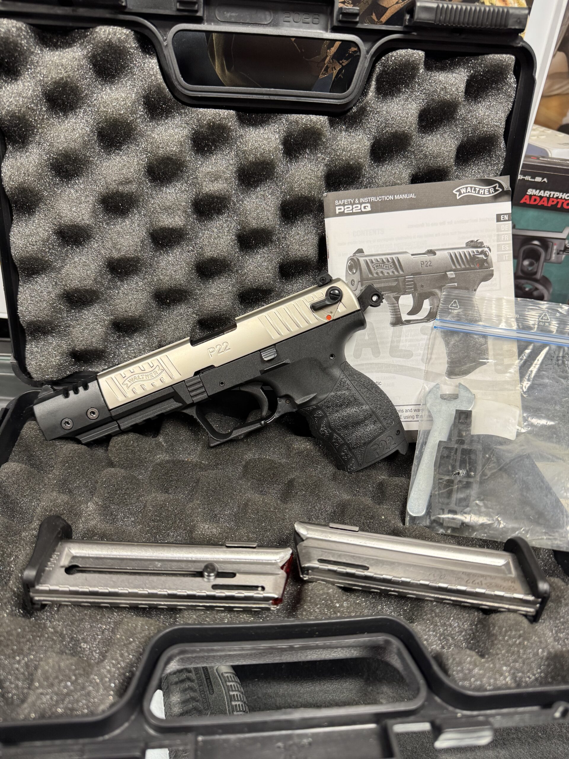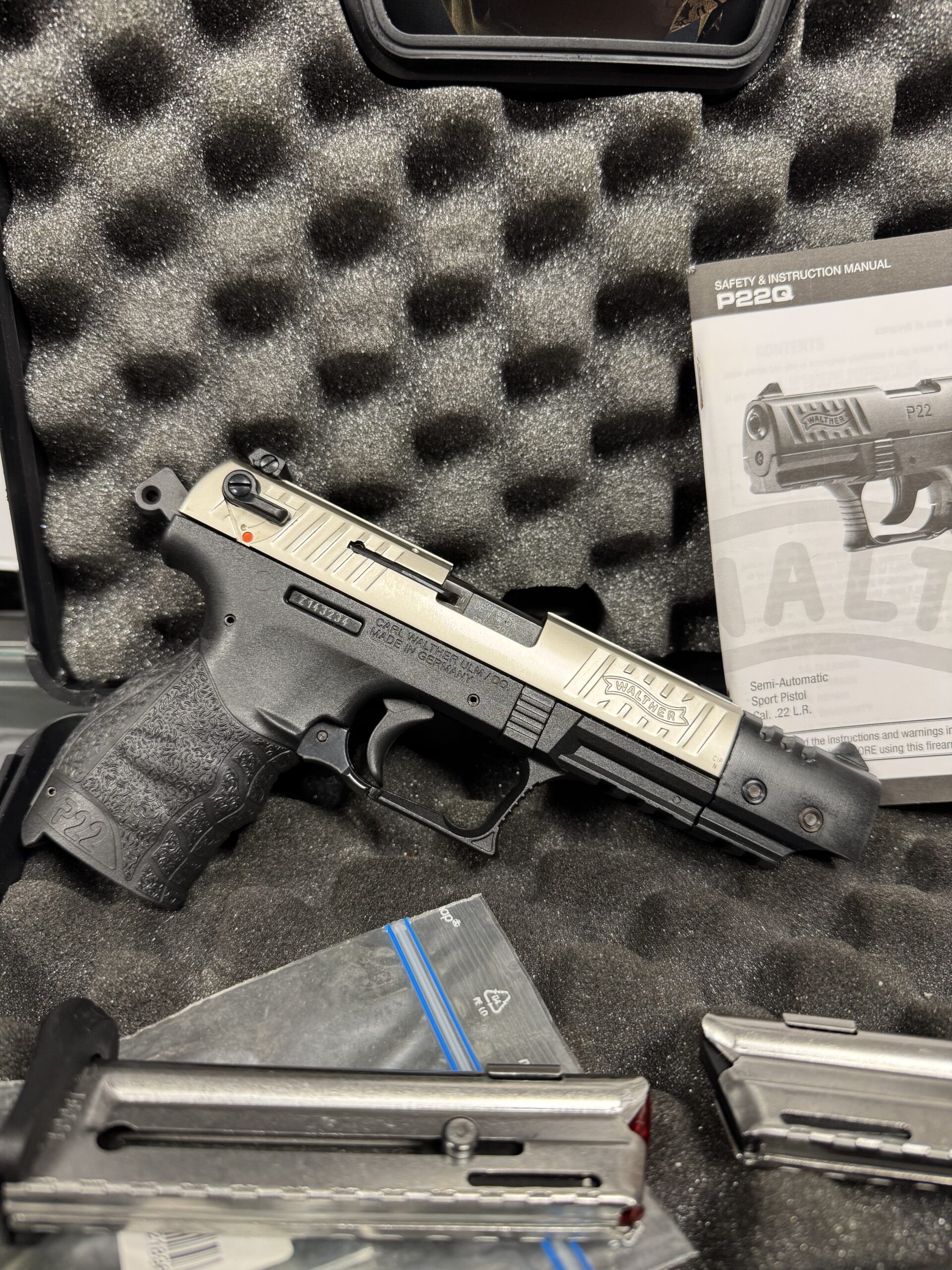 Odlična rabljena malokaliberska pištola Walther P22q v nickel izvedbi. Zelo malo ustreljenih strelov, odlična ohranjenost, brez znakov uporabe. V setu vse kot ob nakupu, kovček, navodila, 2x magazin.